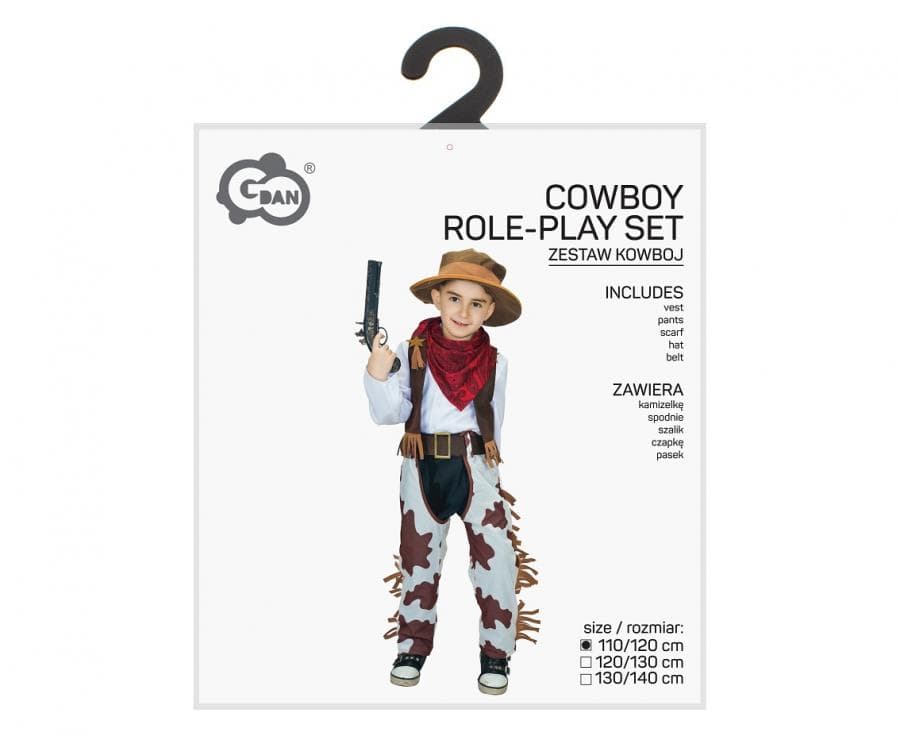 Przebranie Kowboj jest w rozmiarze 110/120 cm. W skład stroju wchodzą: spodnie, kamizelka, chusta, czapka, pasek. Wykonany został z poliestru. Zestaw nie zawiera pistoletu.