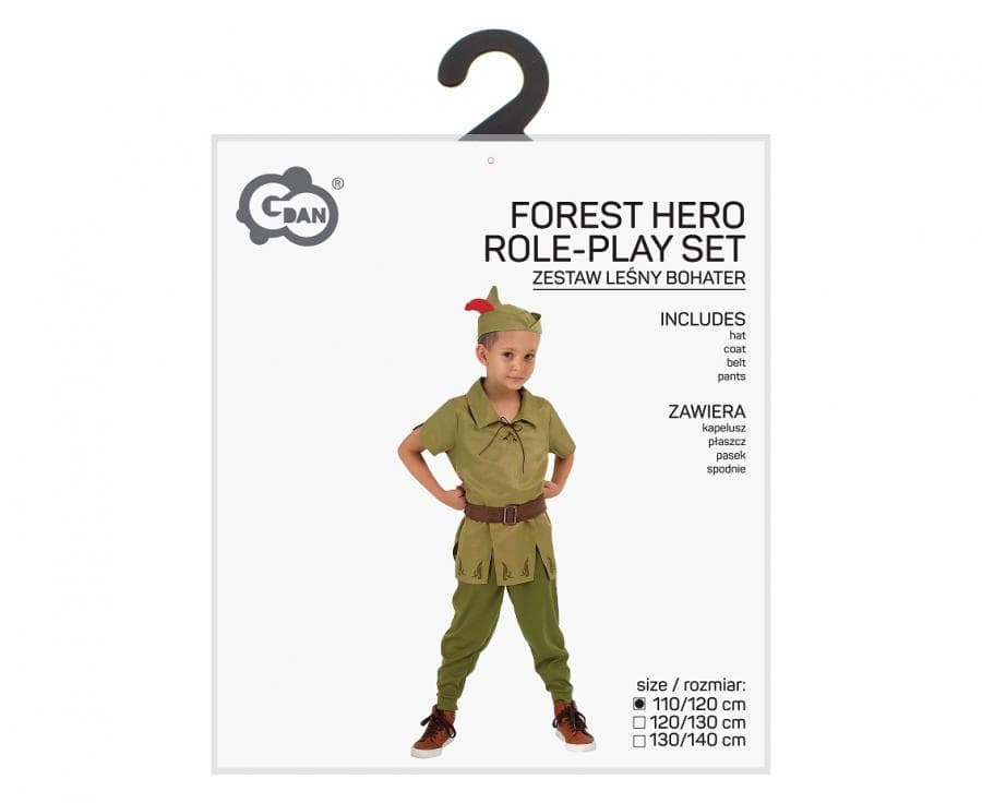 Przebranie Leśny Bohater Piotruś Pan jest w rozmiarze 110/120 cm. W skład stroju wchodzą: koszula, spodnie, kapelusz, pasek. Wykonany został z poliestru.