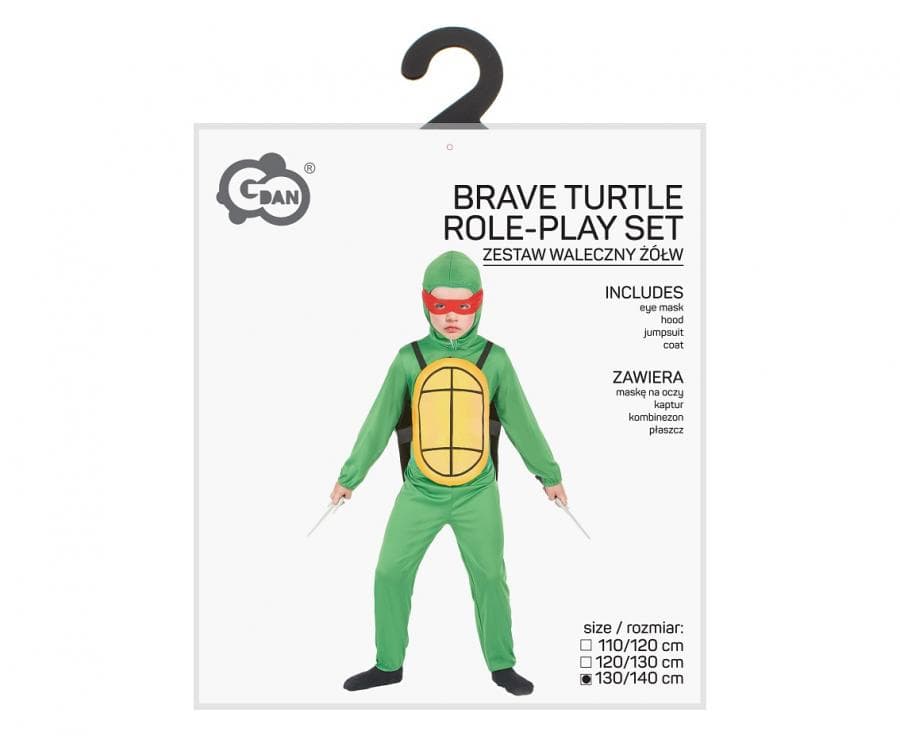 Przebranie Waleczny Żółw Ninja jest w rozmiarze 130/140 cm. W skład stroju wchodzą: kombinezon, płaszcz, kaptur, maska na oczy. Wykonany został z poliestru. Nie zawiera akcesoriów do rąk - sztyletów sai.