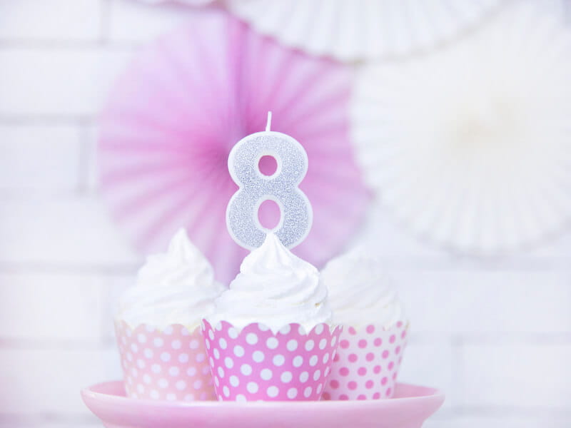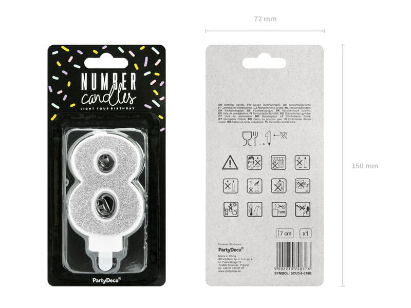 Świeczka z numerkiem "8" to must have w dniu osiemnastych urodzin, ale również ósmych czy osiemdziesiątych. Warto podkreślić taki magiczny wiek piękną świeczką w kolorze srebrnym. Jest ozdobiona brokatem, dzięki któremu osiągamy świetlisty, niezapomniany efekt.