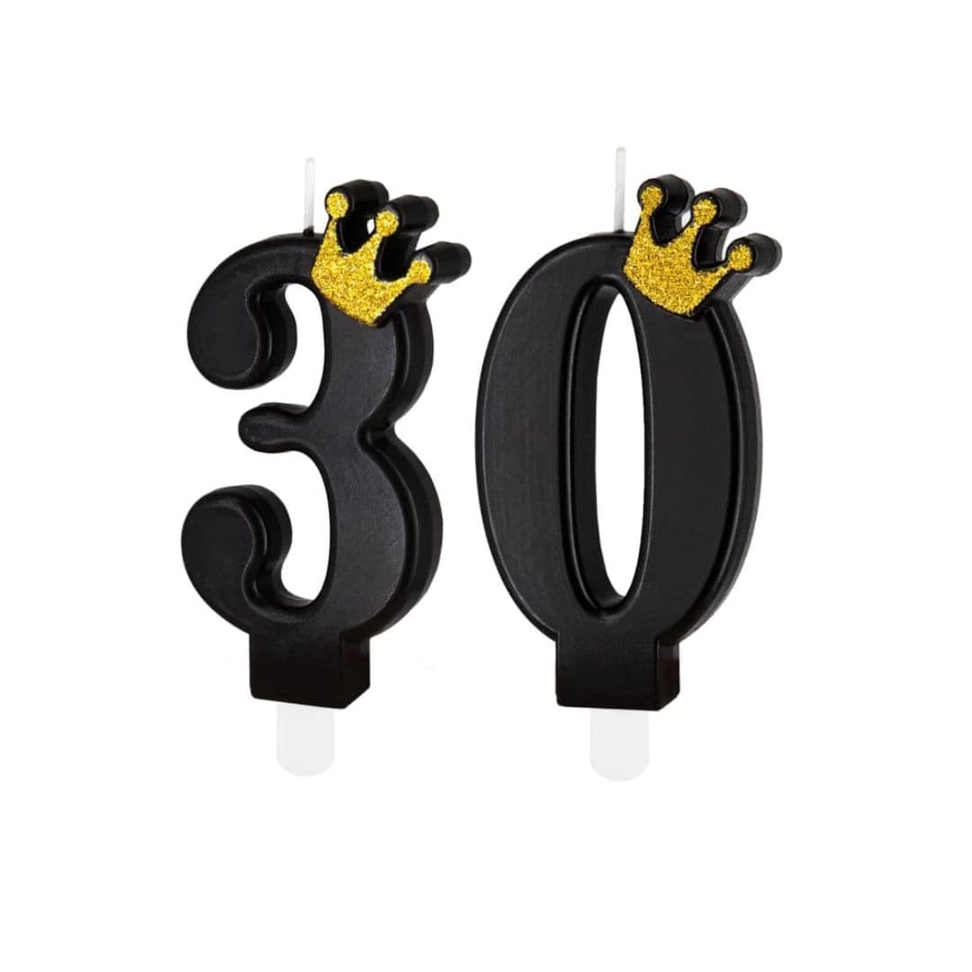 Świeczka urodzinowa na tort w kształcie liczby "30" jest w kolorze czarnym, a jej czubek zdobi złota, brokatowa korona. Jej wysokość to 8,5 cm. W zestawie znajdują się świeczki liczby "3" i "0".