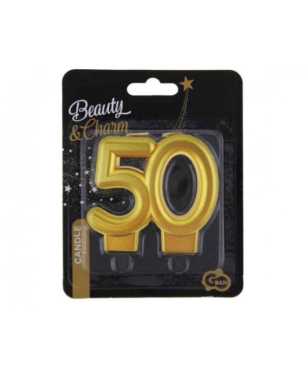 Świeczka liczba 50 ma wysokość ok. 8 cm. Pięknie mieni się dzięki metalicznemu wykończeniu.