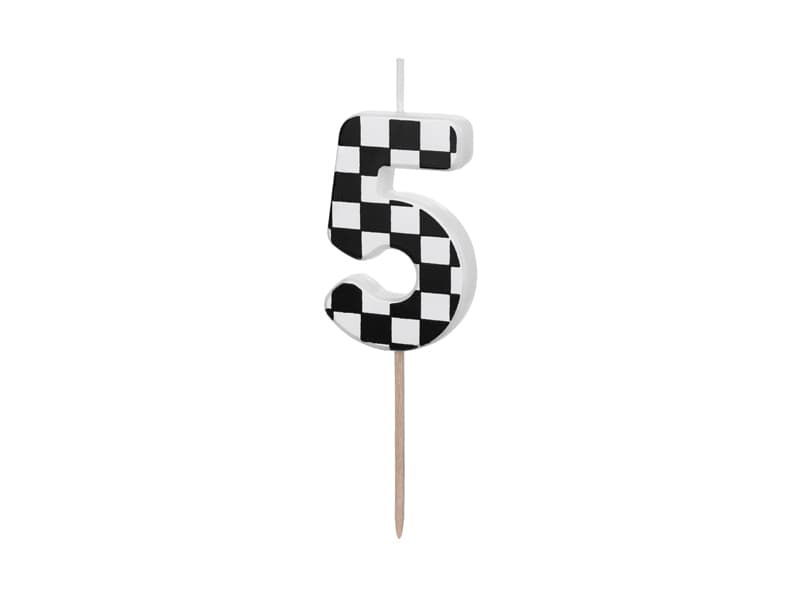 Z tej świeczki cyfry 5 bije wyścigowy duch! Zdmuchnięcie piątki z szachowym wzorem to znak, że urodzinowy wyścig jest w pełni i zwycięstwo jest blisko.