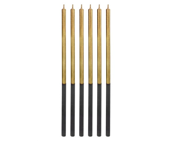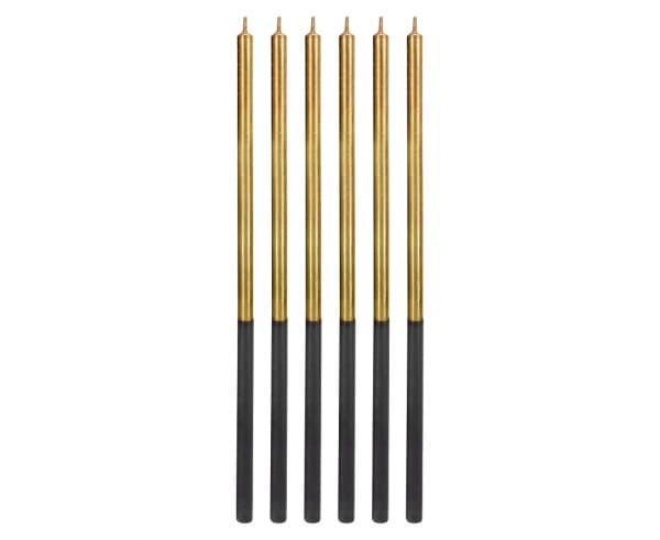 Długie metaliczne świeczki złote pakowane są po 6 sztuk. Dolna część świeczki pokryta jest specjalną powłoką, którą można wbić bezpośrednio w tort. Dzięki temu nie wymagają podstawek. Świeczki mają długość ok. 14,5 cm