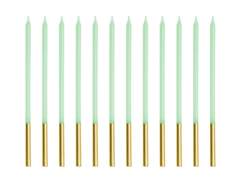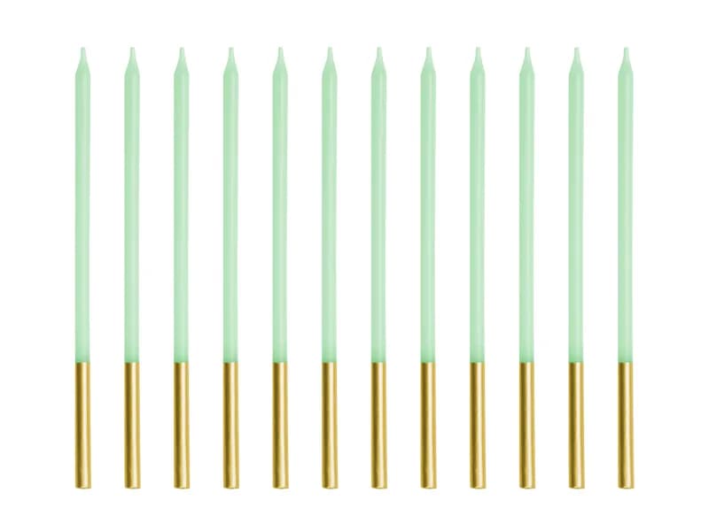 Świeczki na tort proste zielone jasne mają wysokość ok. 14 cm. W opakowaniu znajduje się 12 sztuk świeczek.