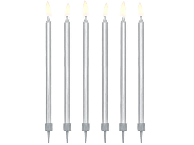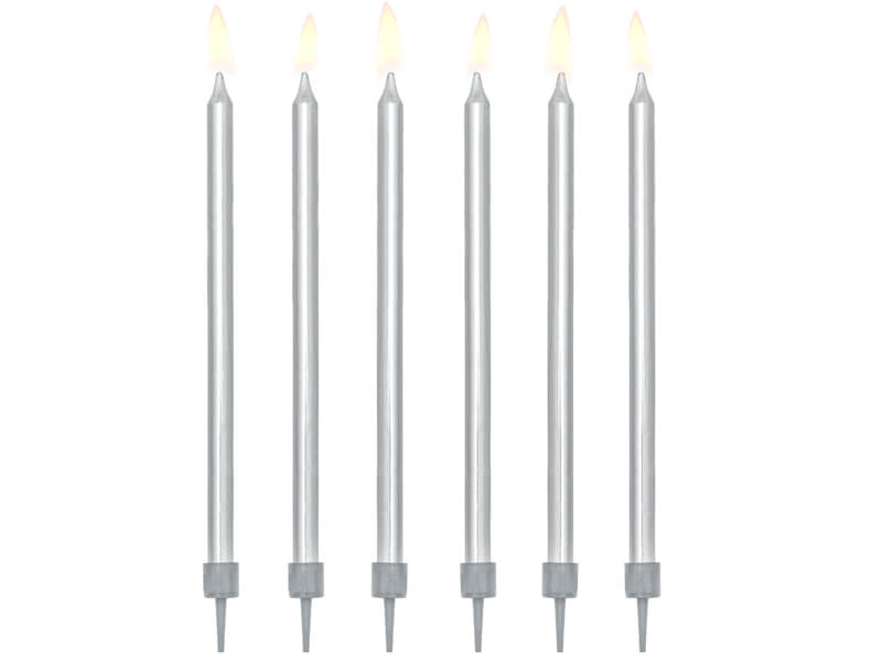 Eleganckie, długie świeczki na tort w kolorze srebrnym będą wspaniałym zwieńczeniem urodzinowego wypieku. Nie ma obaw, że świeczki wypalą się zanim solenizant pomyśli życzenie.