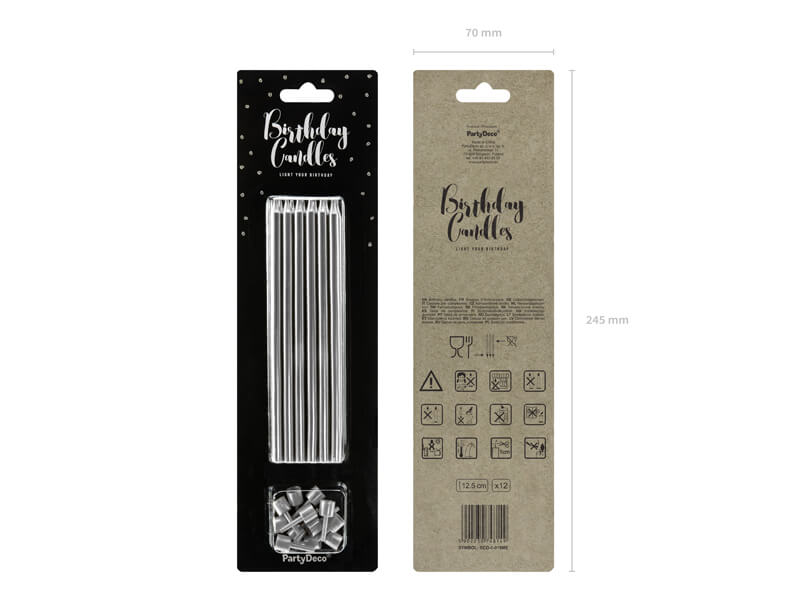 Długie srebrne świeczki urodzinowe mają 12,5 cm. W opakowaniu znajduje się aż 12 świeczek wraz z podstawkami.
