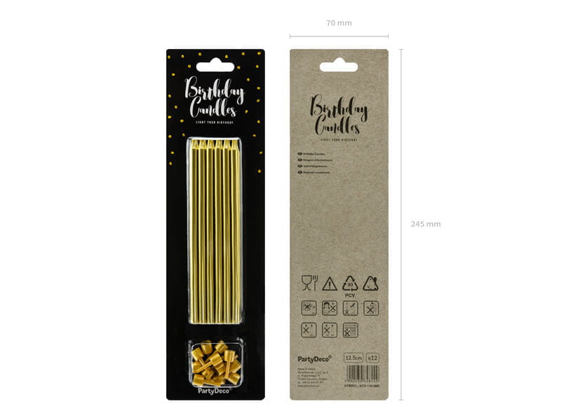Długie świeczki złote na tort mają 12,5 cm. W opakowaniu znajduje się aż 12 świeczek wraz z podstawkami.