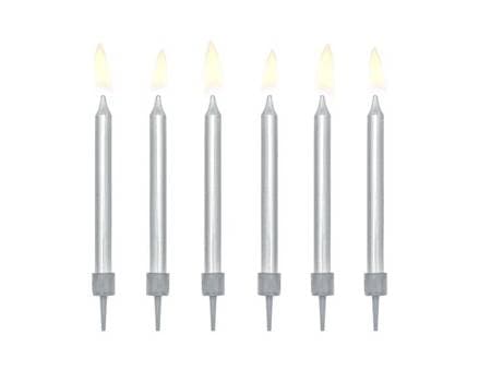 W zestawie znajduje się 6 srebrnych świeczek na tort o długości 6 cm.