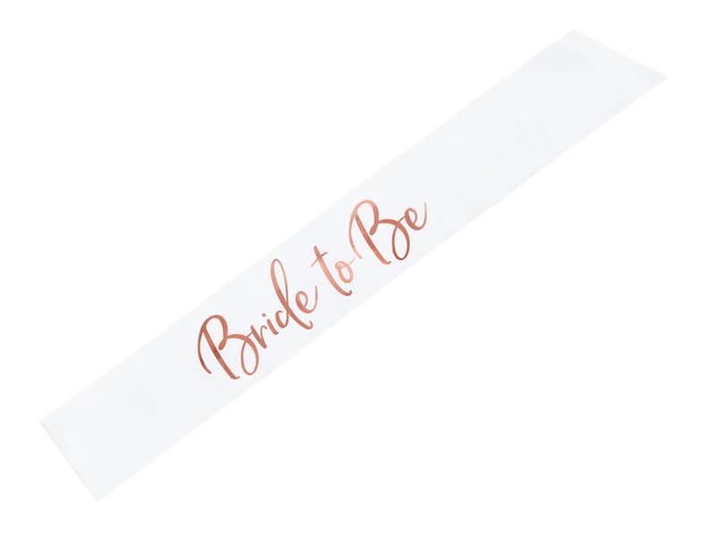 Szarfa satynowa Bride to be w kolorze białym z metalicznym nadrukiem w kolorze różowego złota, szerokość ok. 10 cm, długość ok. 75 cm.
