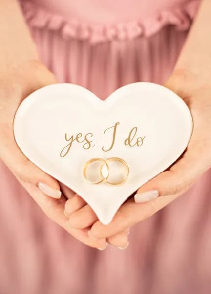 Talerzyk porcelanowy na obrączki ze złotym napisem "yes, I do" ma wymiary ok. 13,3 x 11 cm.