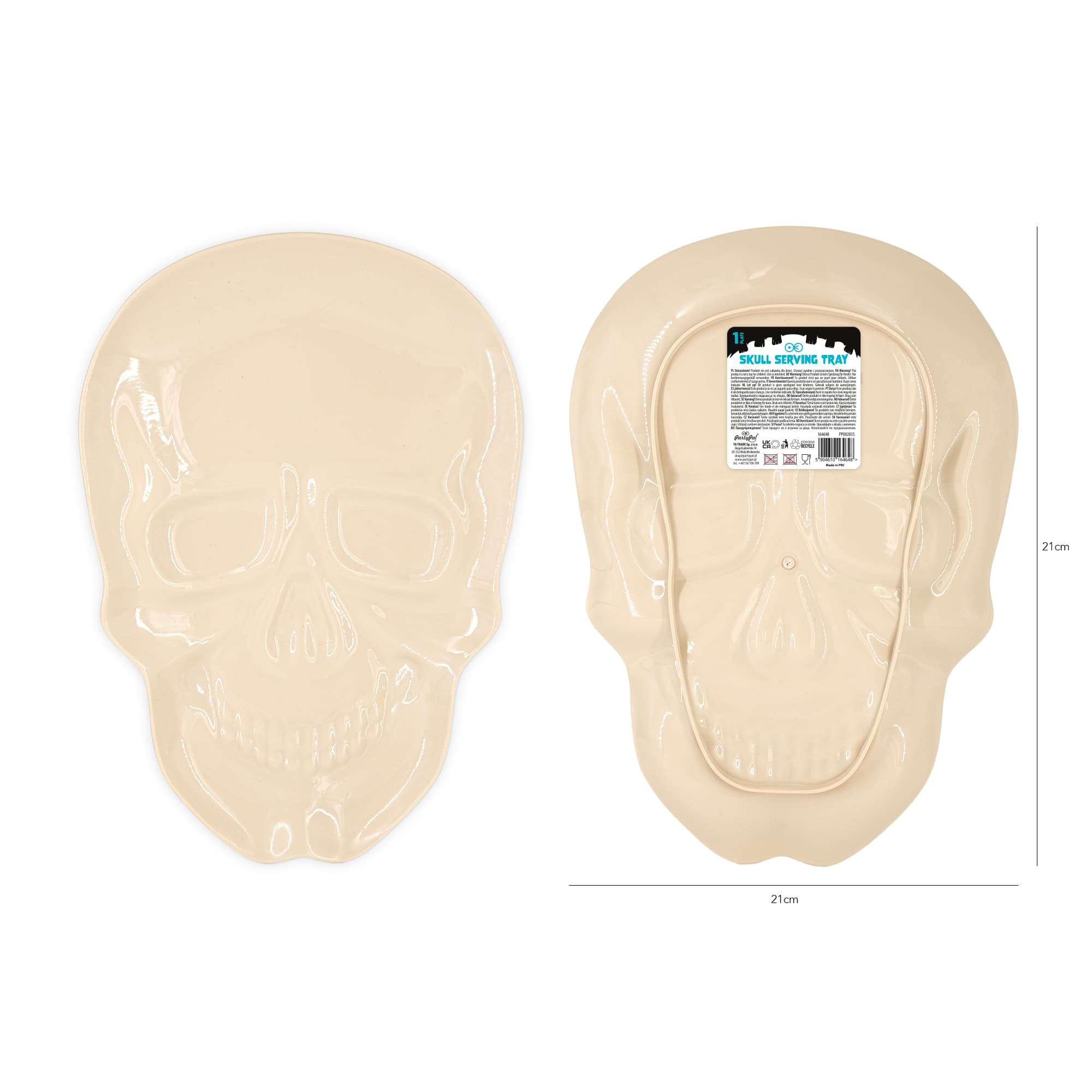 Tacka talerzyk plastikowy na przekąski Czaszka Halloween ma wymiary 23 x 33 cm. Talerzyk jest wielokrotnego użytku. W opakowaniu znajduje się 1 sztuka.