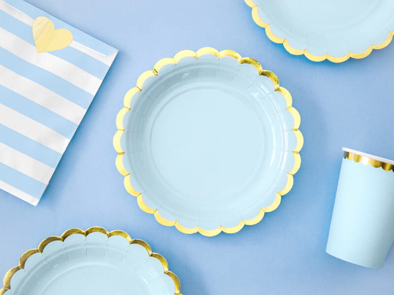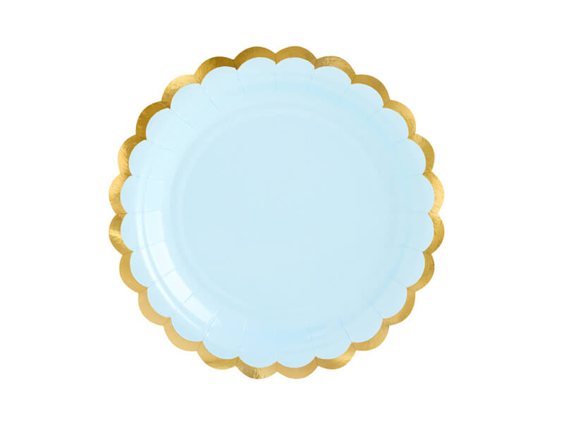 Talerzyki papierowe jasny niebieski złoty brzeg, 18 cm 6 szt.
