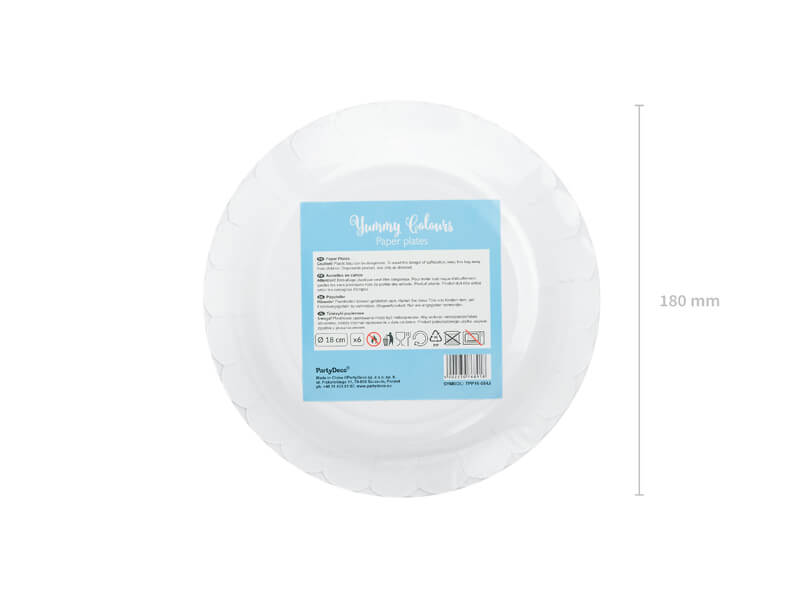 Talerzyki papierowe jasnoniebieskie mają rozmiar ok. 18 cm. W opakowaniu znajduje się 6 sztuk.