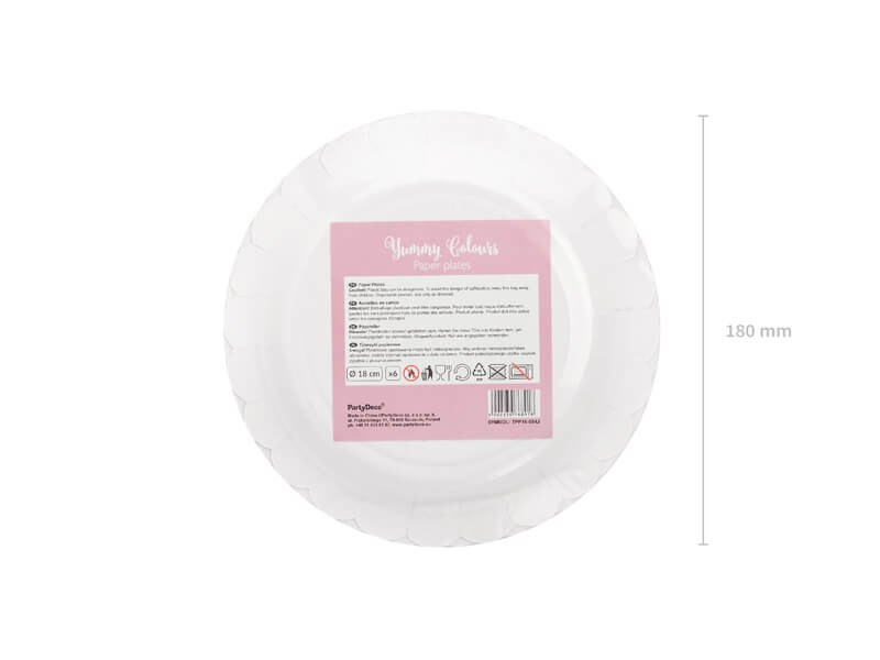 Talerzyki papierowe jasny różowy mają średnice około 18 cm. Opakowanie zawiera 6 sztuk.