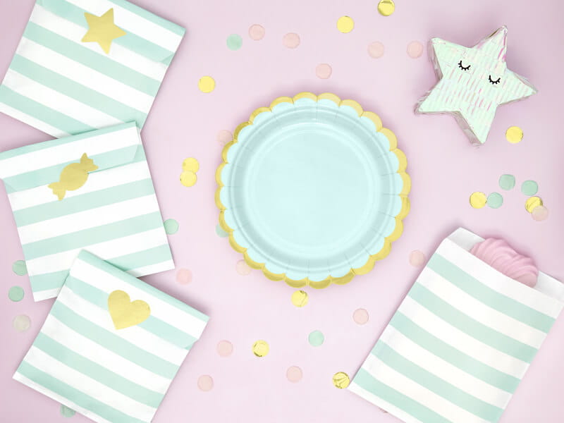 Talerzyki papierowe miętowe świetnie komponują się z innymi ozdobami w kolorze miętowym.