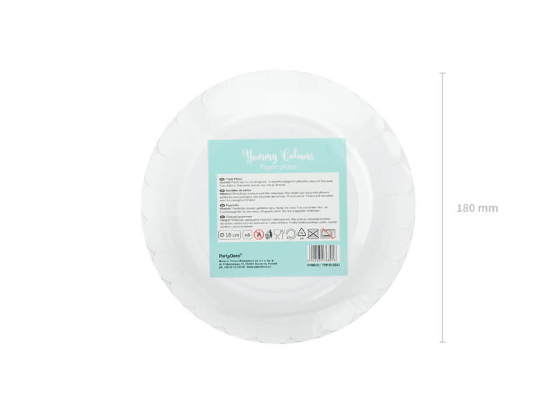 Talerzyki papierowe w kolorze miętowym mają średnicę ok. 18 cm. Opakowanie zawiera 6 sztuk.