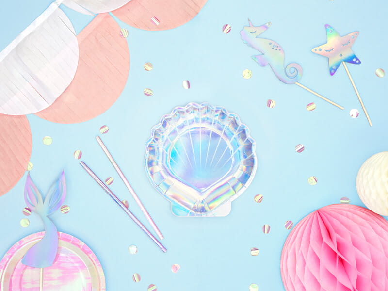 Pięknie mieniące się talerzyki muszle wspaniale sprawdzą się na urodzinach z motywem syrenki. Opalizujący kolor przywodzi na myśl syreni ogon. Świetnie wygląda razem z innymi opalizującymi dekoracjami.