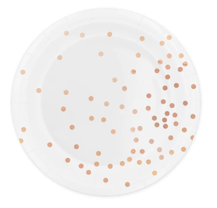 Talerzyki papierowe białe w kropki rose gold mają średnicę 18 cm. W zestawie znajduje się 6 sztuk.