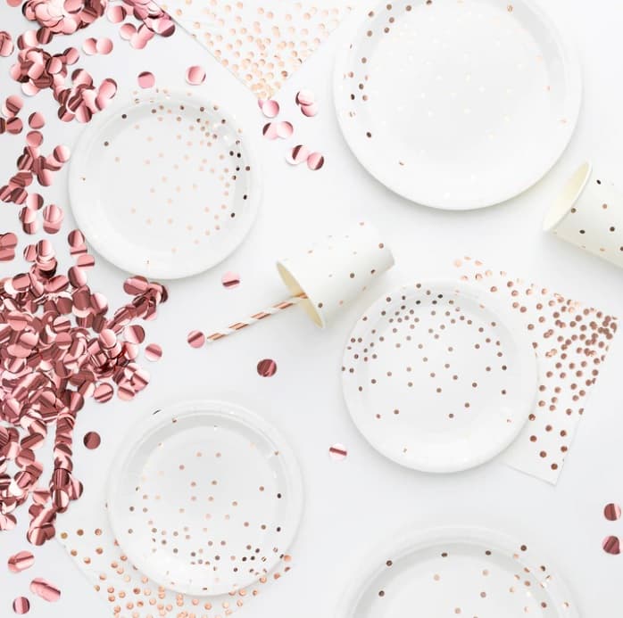 Talerzyki papierowe białe w kropki różowe złoto to świetny pomysł na motyw zastawy stołowej. Klasyczna biel połączona wraz ze złotym różem sprawi, że dekoracja stołu będzie wyglądać inaczej niż zwykle. Na pewno zaskoczy ona zaproszonych gości.