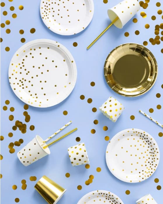 Talerzyki papierowe białe w złote kropki świetnie sprawdzą się na Komunii, Chrzcie lub przyjęciu urodzinowym. Klasyczny biały talerzyk z nutką złota w formie małych kropeczek będzie wyglądał bardzo elegancko, a zarazem nowocześnie na imprezowym stole.