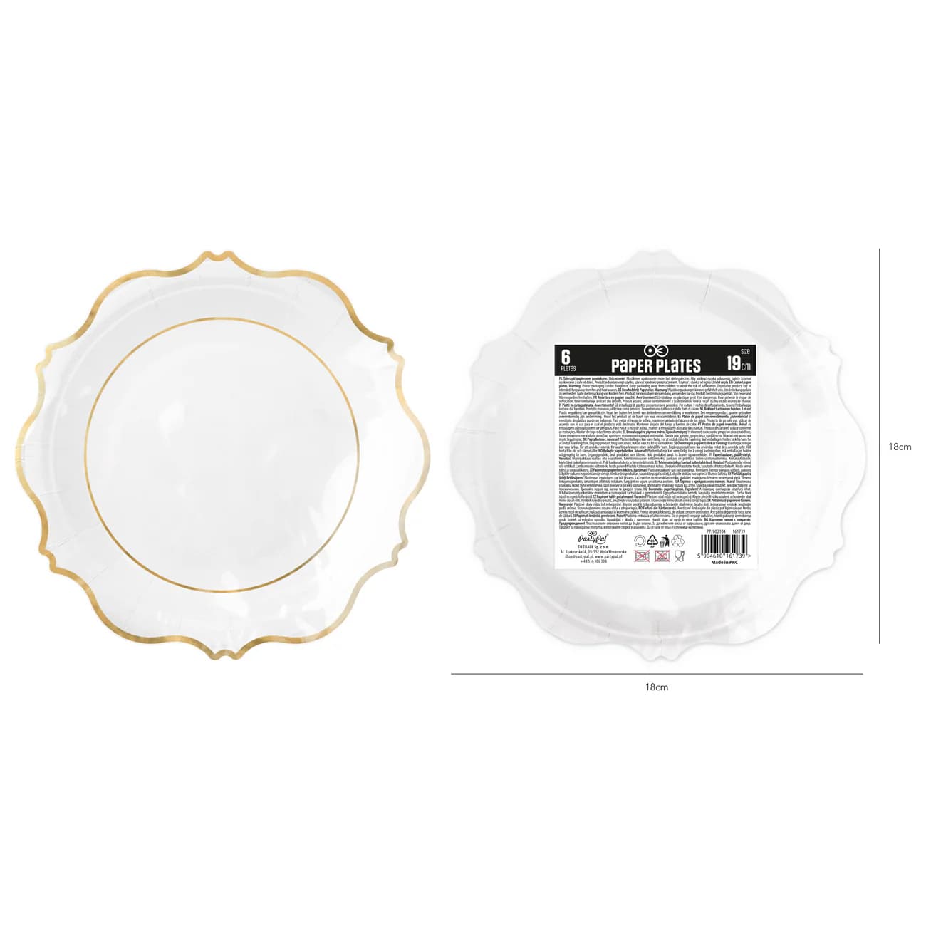 Eleganckie białe talerzyki papierowe ze złotym brzegiem mają średnicę ok. 18 cm. W opakowaniu znajduje się 6 sztuk.