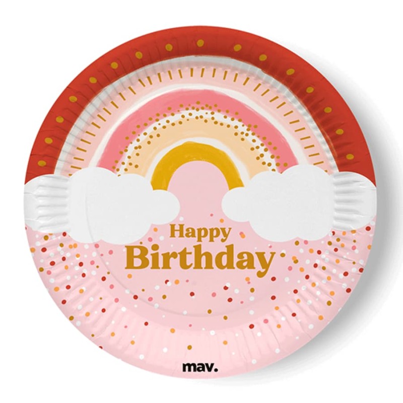 Talerzyki papierowe Happy Birthday to prawdziwa gratka dla miłośników motywu boho. Tęcza w klasycznych kolorach znakomicie reprezentuje ten styl, który charakteryzuje się naturalnością barw, materiałów i bogactwem wzorów. Spraw, aby przyjęcie urodzinowe nabrało naturalnego klimatu, dzięki czemu goście poczują się przytulnie i nastrojowo.