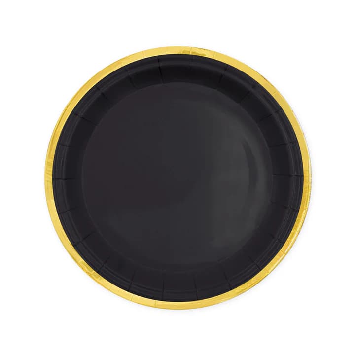 Talerzyki papierowe ze złotym brzegiem w kolorze czarnym mają średnicę 18 cm. W opakowaniu znajduje się 6 sztuk.