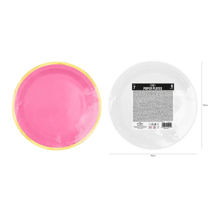Talerzyki papierowe ze złotym brzegiem w kolorze fuksji mają średnicę 18 cm. W opakowaniu znajduje się 6 sztuk.