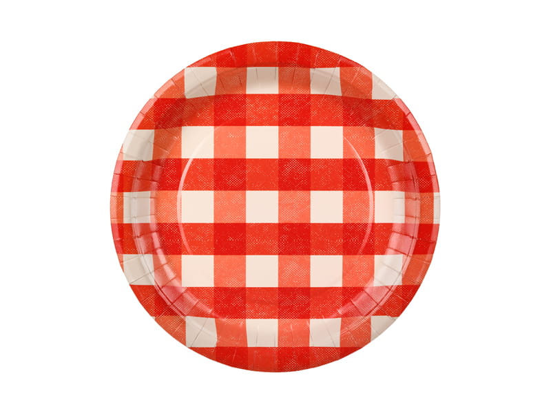 Talerzyki papierowe w czerwoną kratkę mają średnicę ok. 27 cm. W opakowaniu znajduje się 6 sztuk.