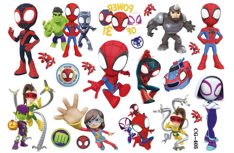 Przemień każdy dzień w superbohaterską przygodę dzięki tym tatuażom zmywalnym, które pozwalają dzieciom nosić na skórze niezrównane symbole i postacie ze świata małego Spider-Mana. Niech każdy tatuaż dodaje mocy i inspiruje młodych fanów do odkrywania swoich wewnętrznych supermocy, jednocześnie oferując bezpieczną i zabawną formę ekspresji dla dzieci w każdym wieku.
