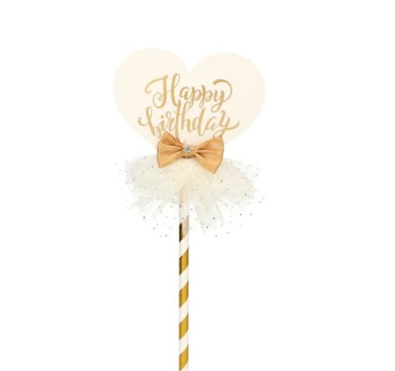 Topper na tort serce Happy Birthday w kolorze biało-złotym ma wymiary ok. 22 × 8 cm. W opakowaniu znajduje się 1 sztuka.