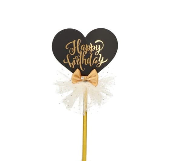 Topper na tort serce Happy Birthday w kolorze czarno-złotym ma wymiary ok. 22 × 8 cm. W opakowaniu znajduje się 1 sztuka.