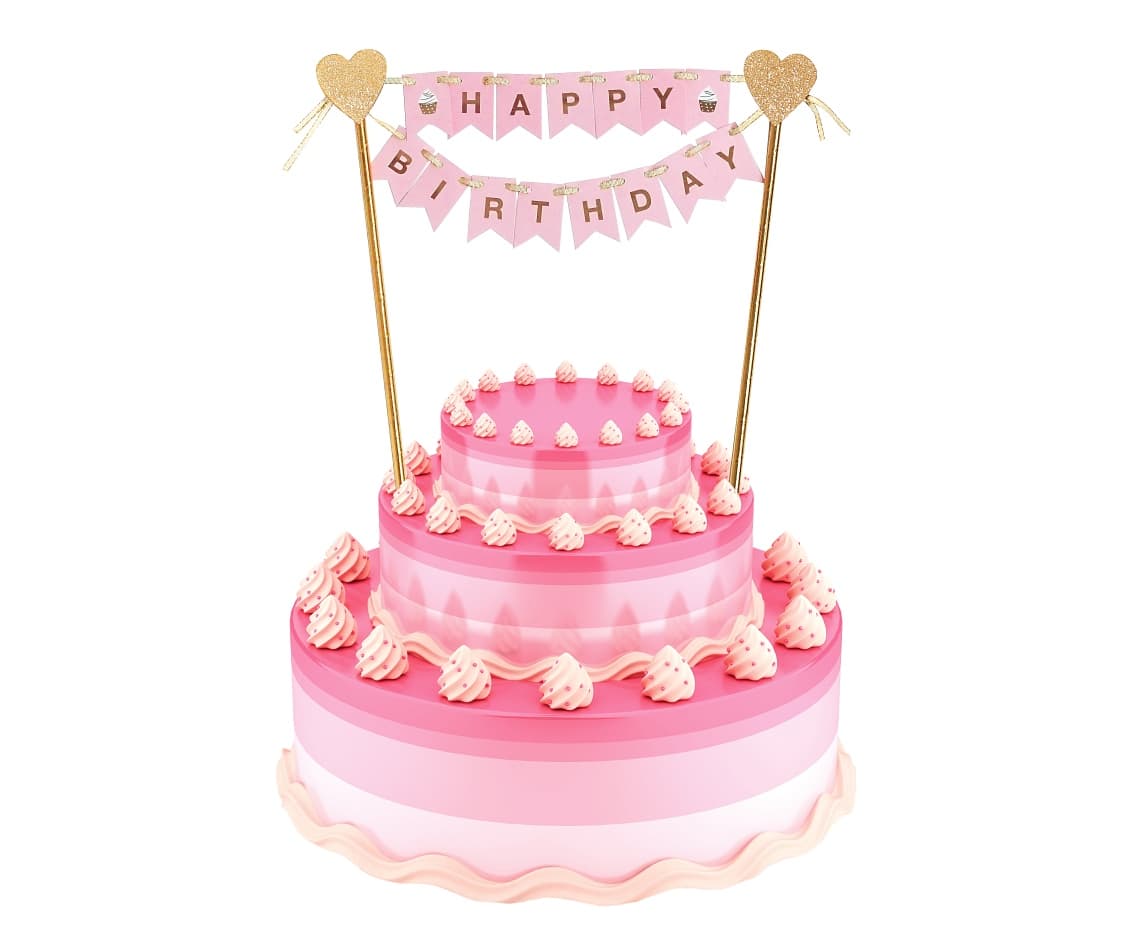 Różowo złoty topper na tort z banerem Happy Birthday to wspaniała dekoracja urodzinowego wypieku. Wygląda przepięknie na torcie będąc oryginalną ozdobą.