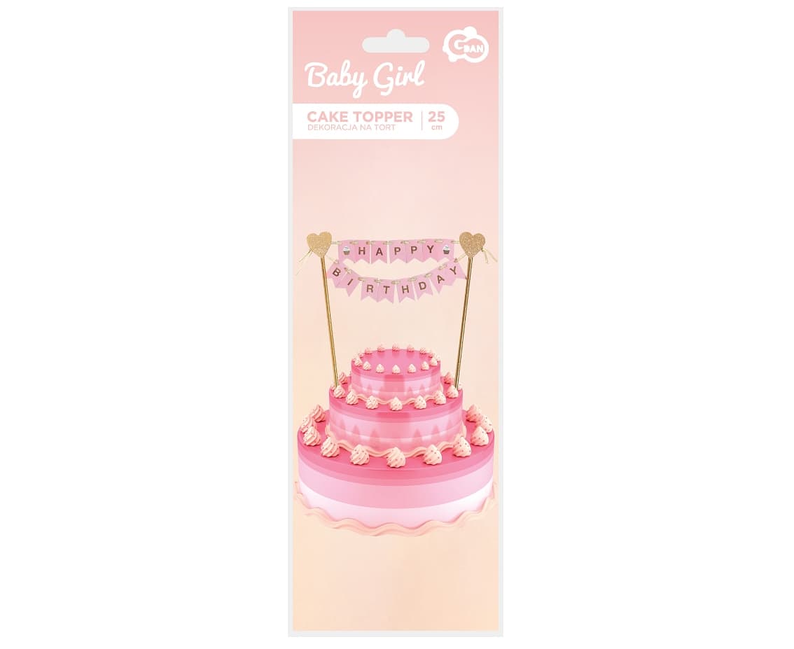 Topper z girlandą Happy Birthday ma wysokość ok. 25 cm. Zestaw zawiera 2 słomki oraz mini baner "Happy Birthday".