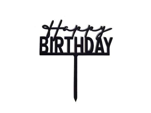 Topper na tort z pleksi Happy Birthday w kolorze czarnym ma wymiary 11 × 10 cm.