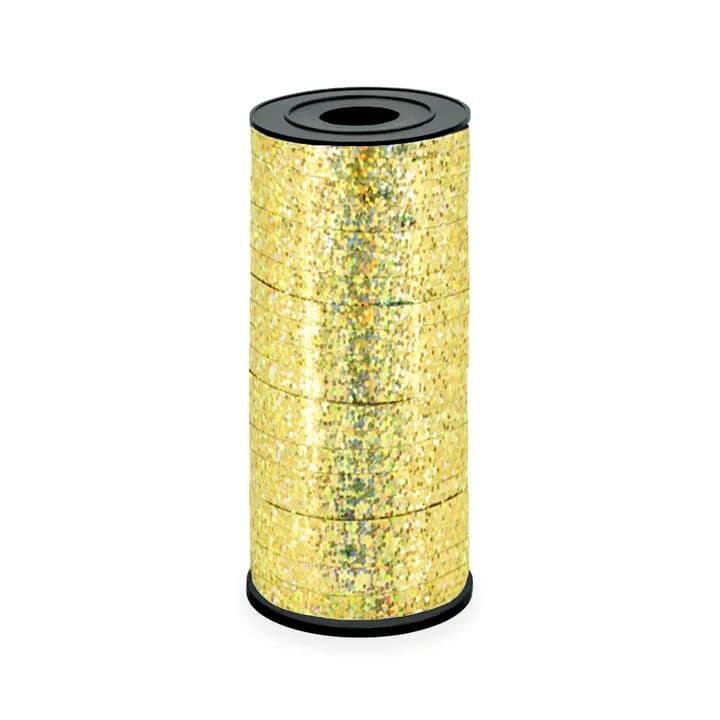 Złota holograficzna wstążka do balonów ma ok. 92 metry długości i ok. 5 mm szerokości.