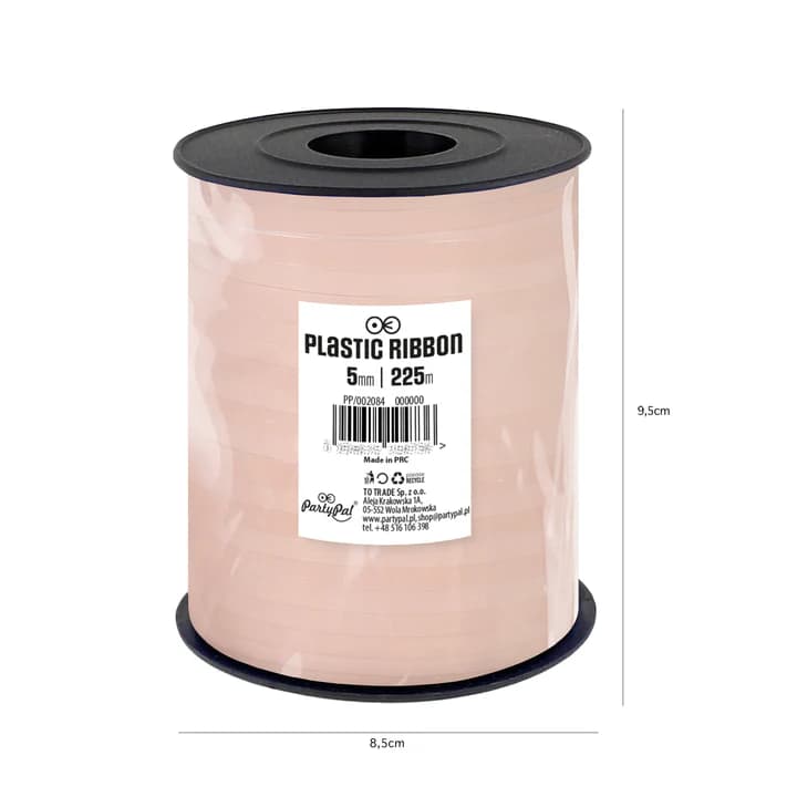 Wstążka plastikowa pastelowa pudrowa różowa do balonów ma długość ok. 225 metry i szerokość ok. 5 mm.