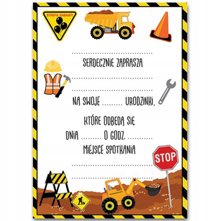 Organizując przyjęcie z motywem małego budowniczego, warto już podczas zapraszania gości zasugerować w jakiej tematyce będzie impreza. Świetnie sprawdzą się tutaj zaproszenia z placem budowy. Są do samodzielnego wypełnienia, więc całą treść można dopasować do okazji.