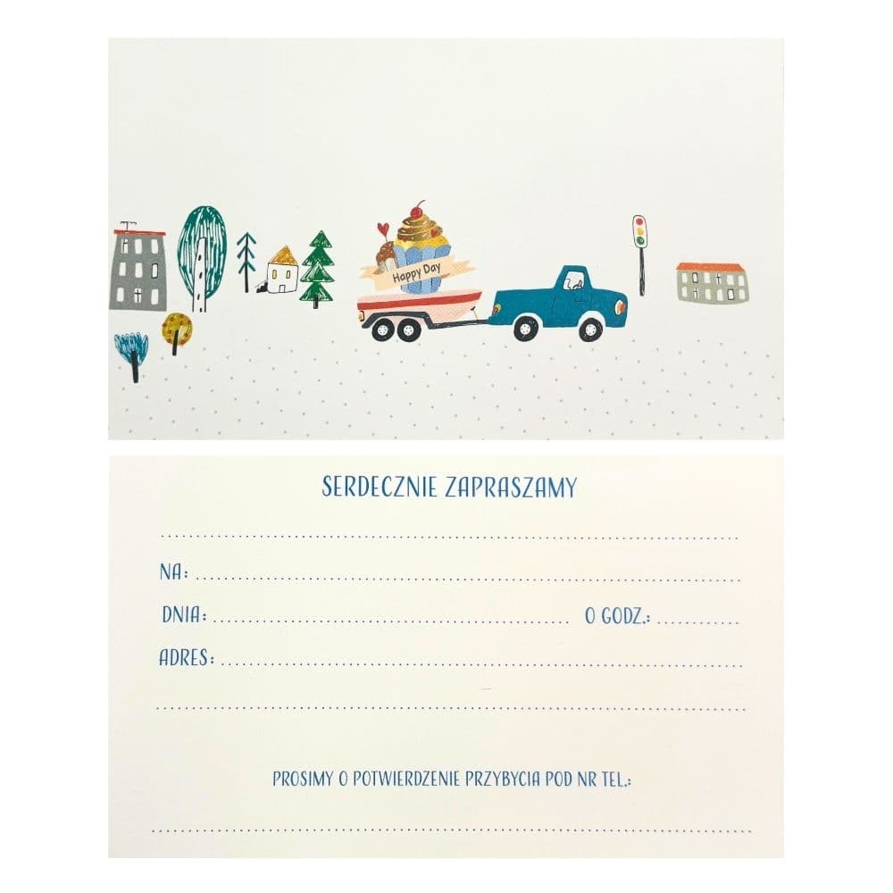 Zaproszenia z motywem autek mają wymiary ok. 16 × 9,5 cm. W opakowaniu znajduje się 10 sztuk zaproszeń z kopertami.