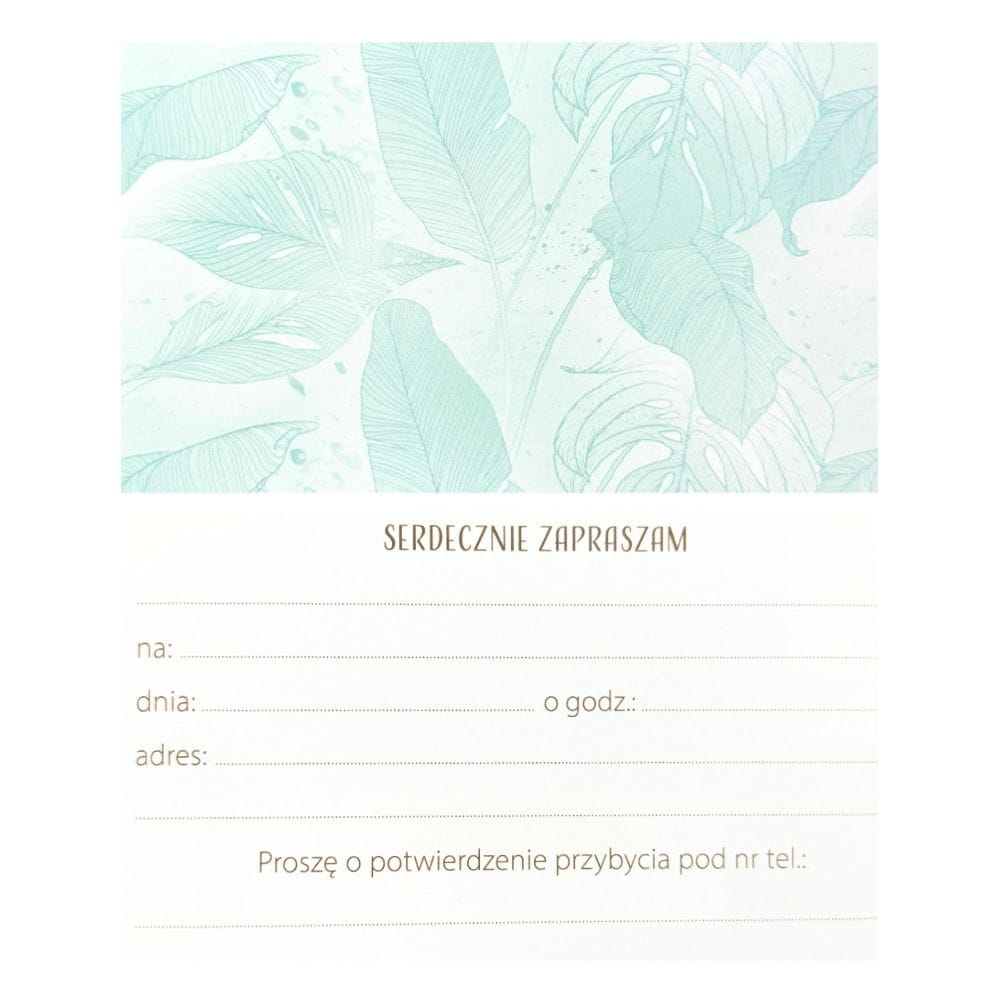 Zaproszenia z motywem liści mają wymiary ok. 16 × 9,5 cm. W opakowaniu znajduje się 10 sztuk zaproszeń z kopertami.