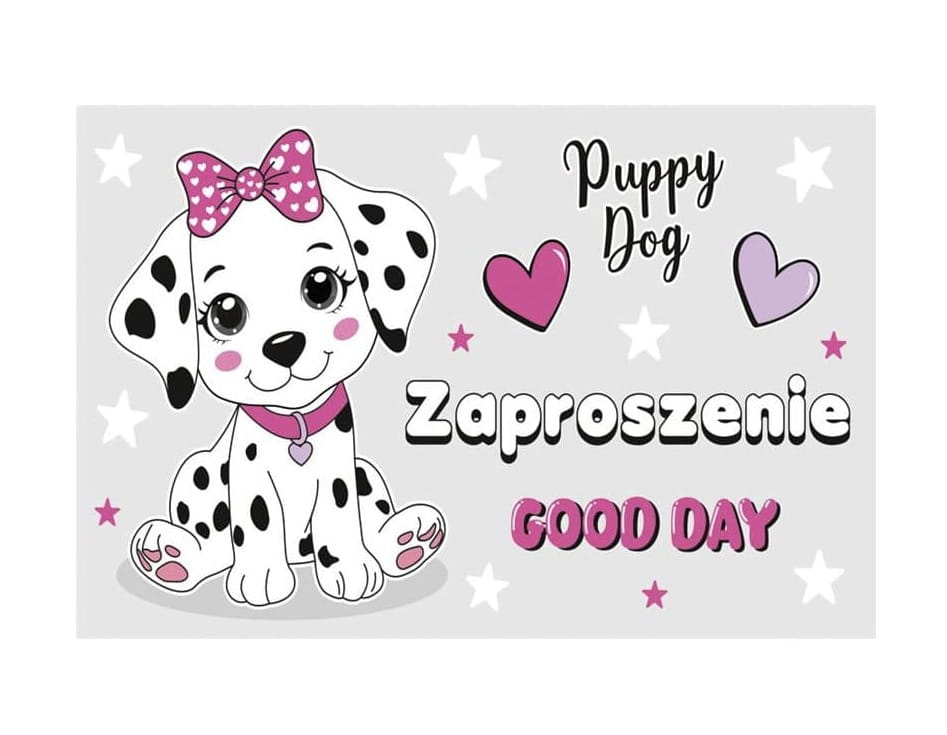Czarno-białe łatki i mnóstwo uroku – dalmatyńczyk gotowy na imprezę! Zaproszenia z wesołym psiakiem to świetny wybór dla dzieci kochających czworonogi. Szykujcie się na zabawę z merdającym ogonem!