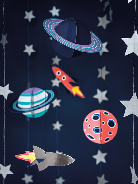 Kosmiczne dekoracje w kształcie planet, rakiet i księżyca sprawdzą się zarówno na imprezę z motywem kosmosu, jak i jako ozdoba do pokoju chłopca.