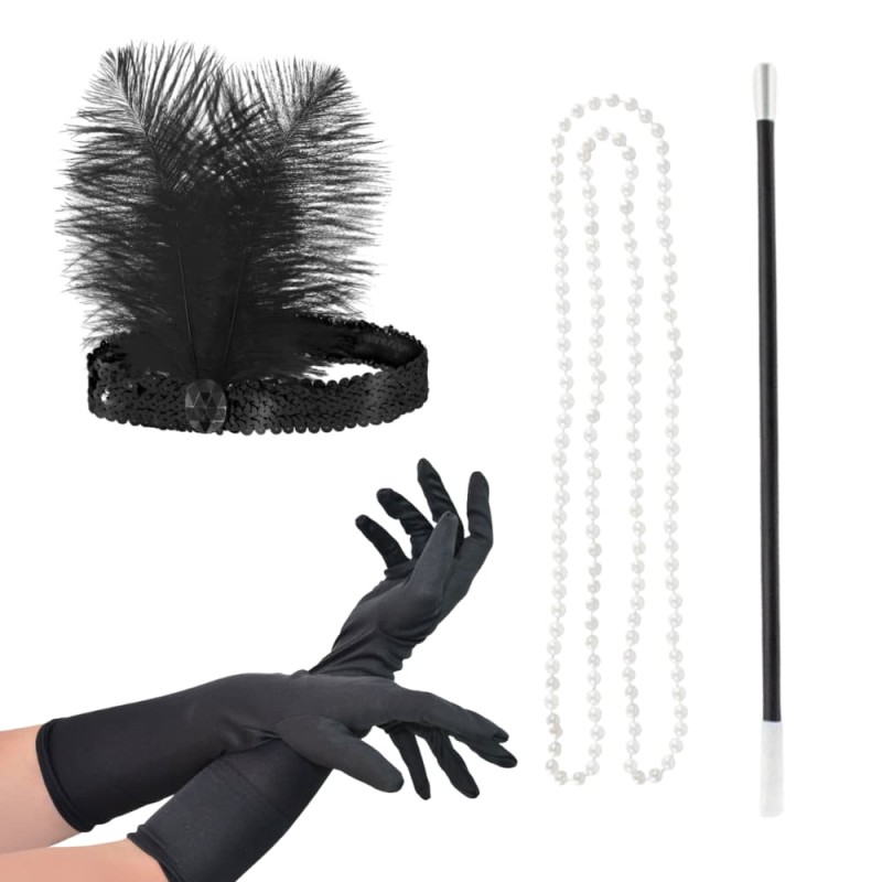 Zestaw retro lata 20 zawiera opaskę cekinową czarną, rękawiczki długie czarne, naszyjnik z białych pereł 80 cm oraz cygaretkę.