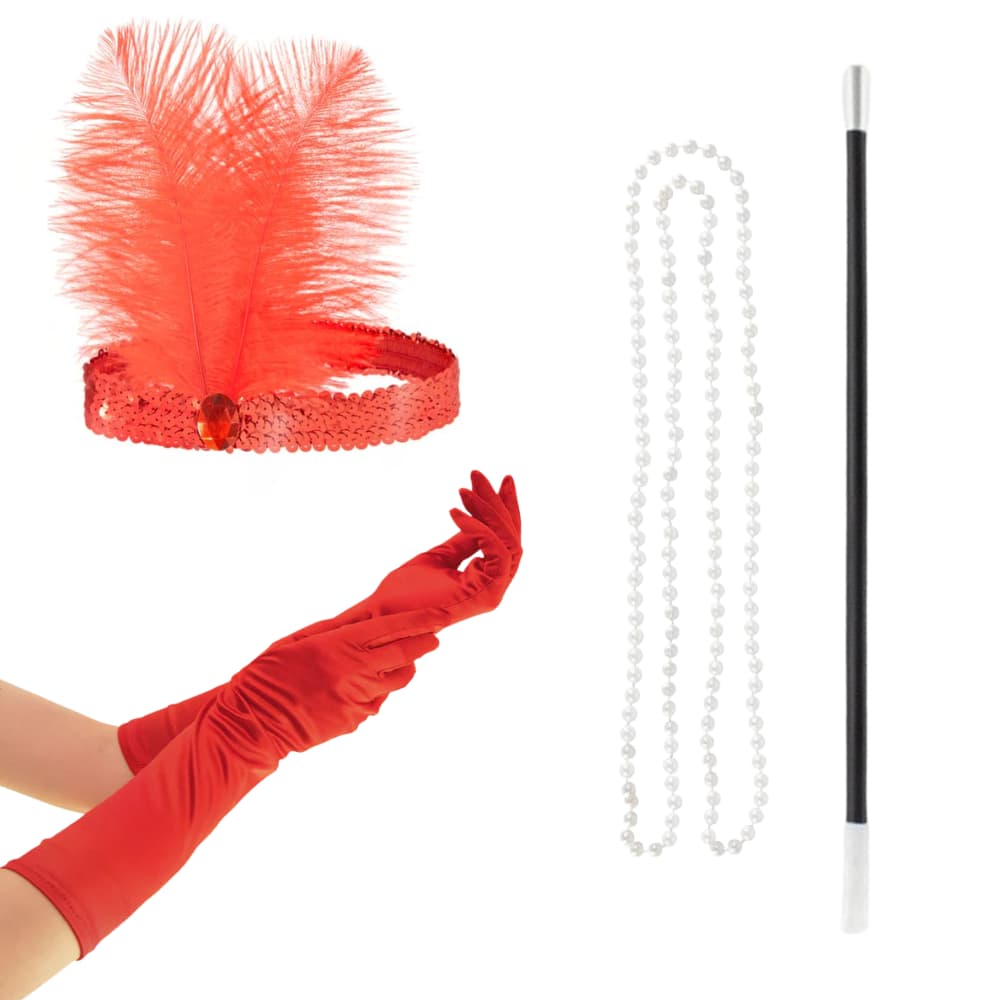 Zestaw akcesoriów retro w kolorze czerwonym posiada opaskę, długie rękawiczki, cygaretkę oraz biały naszyjnik z pereł. Rozmiar jest uniwersalny.