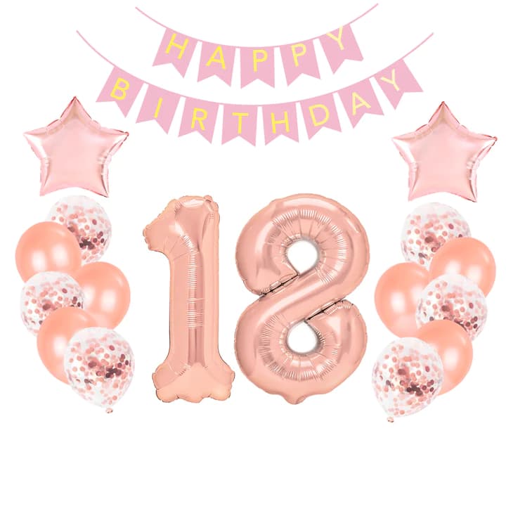 Zestaw dekoracji na 18 urodziny w kolorze rose gold to gotowy pakiet ozdób, dzięki którym stworzysz elegancką i efektowną dekorację. Nadmuchane powietrzem balony możesz przyczepić do szafek czy ściany. Balony można także napełnić helem, aby pięknie się unosiły. Następnie rozwieś girlandę z napisem Happy Birthday i wspaniała dekoracja gotowa!