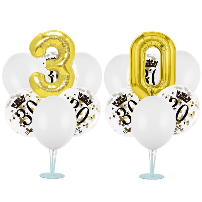Zestaw balonów na stojaku 30 urodziny w kolorze biało-złotym posiada w komplecie: