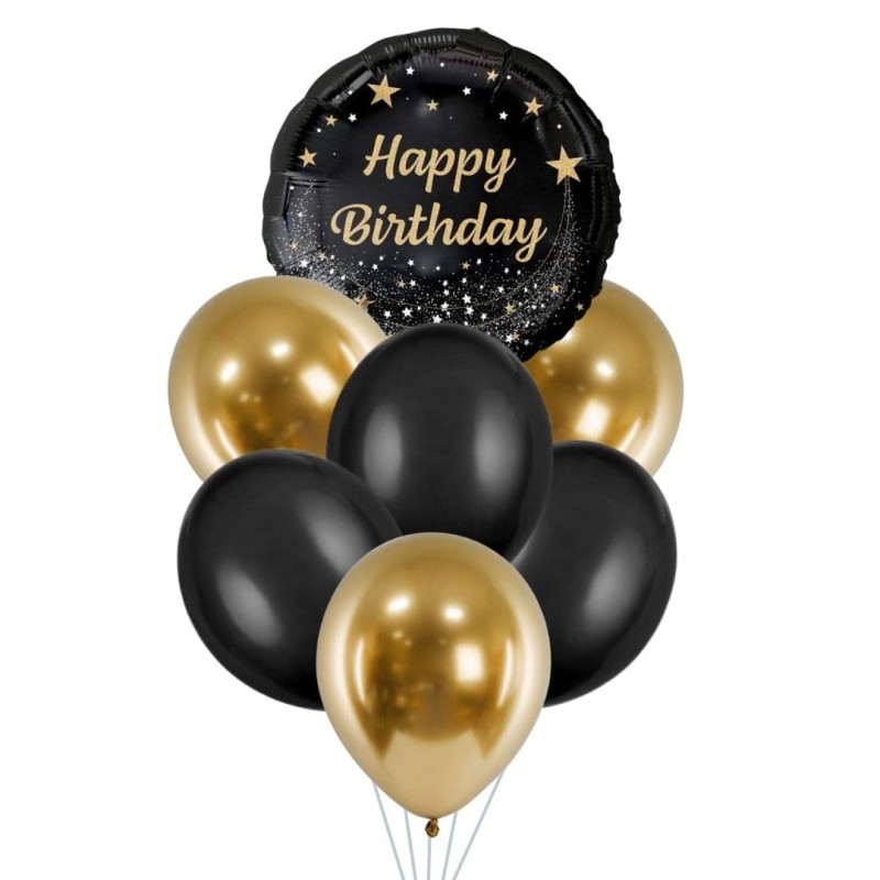 Zestaw balonów na urodziny w kolorze czarno-złotym zawiera w komplecie: