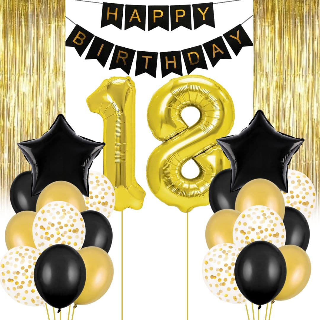 Złoty zestaw balonowy na 18 urodziny zawiera: