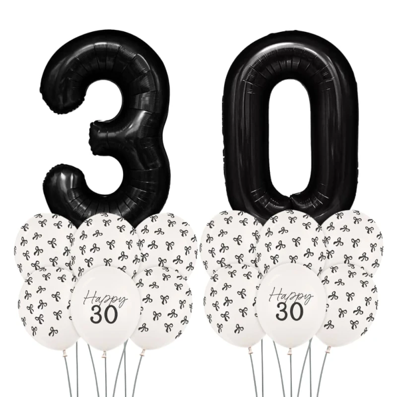 Zestaw balonów na 30 urodziny czarno-biały z kokardkami